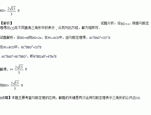如图,△ABC中,CD⊥AB于D,若AD=2BD,AC=6,BC=4,求BD的长.