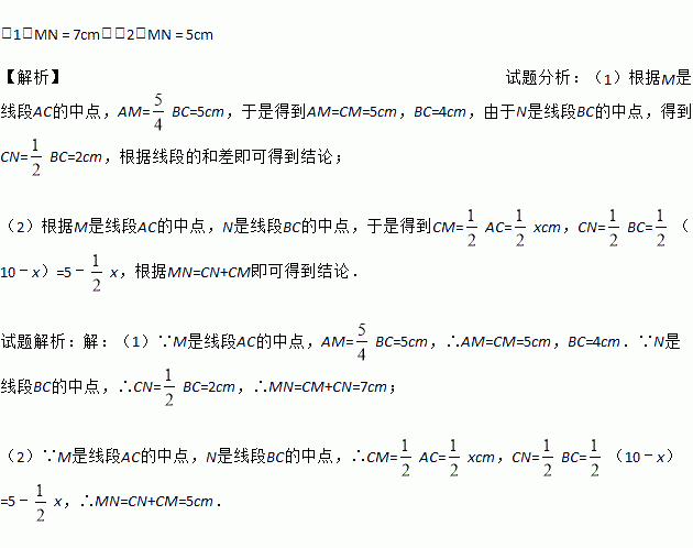 (1)MN = 7cm;(2)MN = 5cm 【解析】试题分析:(1)根据M是线段AC的中点,AM=BC=5cm,于是得到AM=CM=5cm,BC=4cm,由于N是线段BC的中点,得到CN=BC=2cm,根据线段的和差即可得到结论; (2)根据M是线段AC的中点,N是线段BC的中点,于是得到CM=AC=xcm,CN=BC=(10﹣x)=5﹣x,根据MN=CN+CM即可得到结论. ...