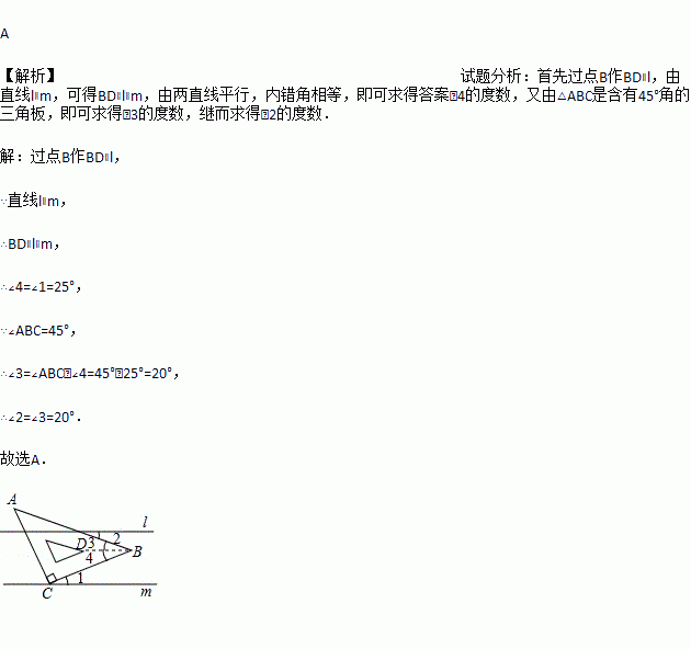 如图,直线l∥m,将含有45°角的三角板ABC的直角顶点C放在直线m上,若∠1=25°,