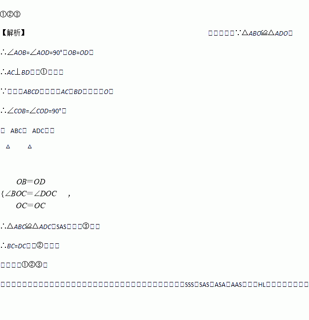 如图,四边形ABCD的对角线AC,BD相交于点O, △ABO≌△ADO。下列结论:①AC⊥BD;②CB=CD;③△ABC≌△ADC;④DA=DC.其中正确结论的序号是______________。