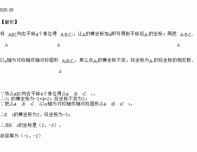如图,△ABC在平面直角坐标系中第二象限内,顶点A的坐标是(﹣2,3),先把△ABC向右平移4个单位得到△A1B1C1 , 再作△A1B1C1关于x轴对称图形△A2B2C2 , 则顶点A2的坐标是________