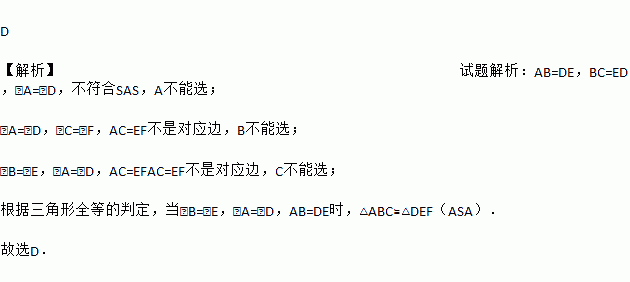 D 【解析】试题解析:AB=DE,BC=ED,∠A=∠D,不符合SAS,A不能选; ∠A=∠D,∠C=∠F,AC=EF不是对应边,B不能选; ∠B=∠E,∠A=∠D,AC=EFAC=EF不是对应边,C不能选; 根据三角形全等的判定,当∠B=∠E,∠A=∠D,AB=DE时,△ABC≌△DEF(ASA). 故选D.