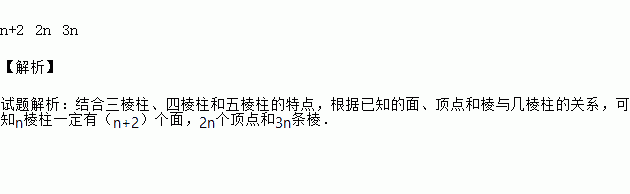 已知三棱柱有5个面6个顶点9条棱,四棱柱有6个面8个顶点12条棱,五棱柱有7个面10个顶点15条棱,……,由此可以推测n棱柱有_____个面,____个顶点,_____条侧棱.