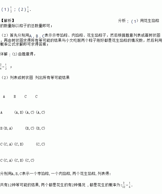 (2)用树状图或列表的方法求出小文吃前两个粽子都是花生馅粽的概率.