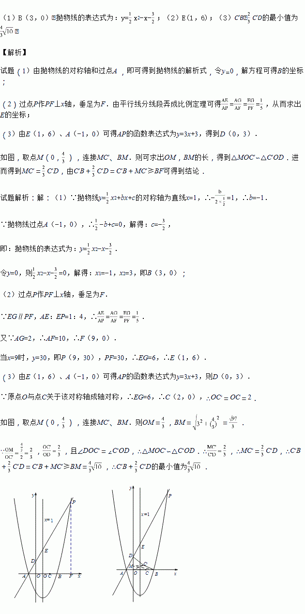 x2+bx+c,与x轴交于A、B两点(点A在点B的左侧),且点A坐标为(-1,0).又P是抛物线上位于第一象限的点,直线AP与y轴交于点D,与抛物线对称轴交于点E,点C与坐标原点O关于该对称轴成轴对称.