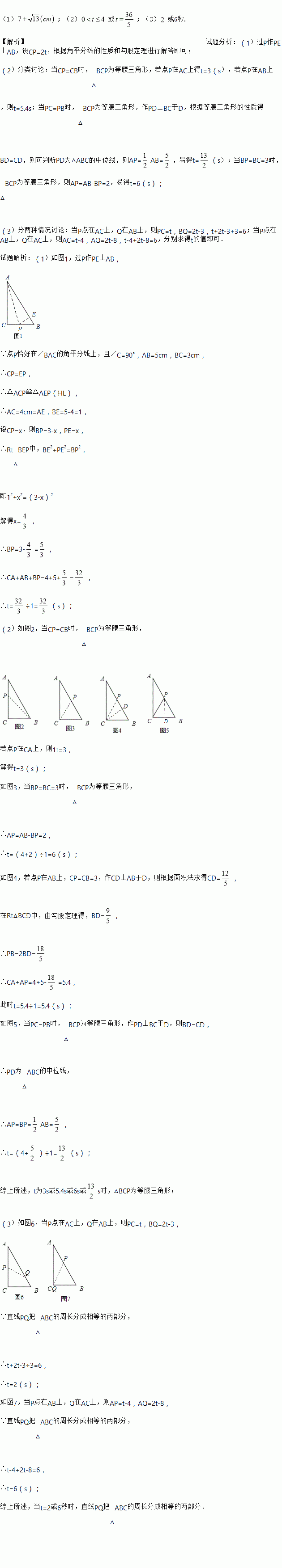 Èçͼ£¬¡÷ABCÖУ¬¡ÏC=Rt¡Ï£¬AB=5cm£¬BC=3cm£¬Èô¶¯µã P´ÓµãC¿ªÊ¼£¬°´C-A-B-CµÄ·¾¶Ô˶¯£¬ÇÒËÙ¶ÈΪÿÃë1cm£¬Éè³ö·¢µÄʱ¼äΪtÃ룮