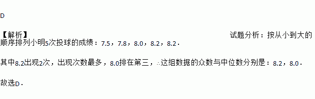 上体育课时,小明5次投掷实心球的成绩如下表所示,则这组数据的众数与中位数分别是( )