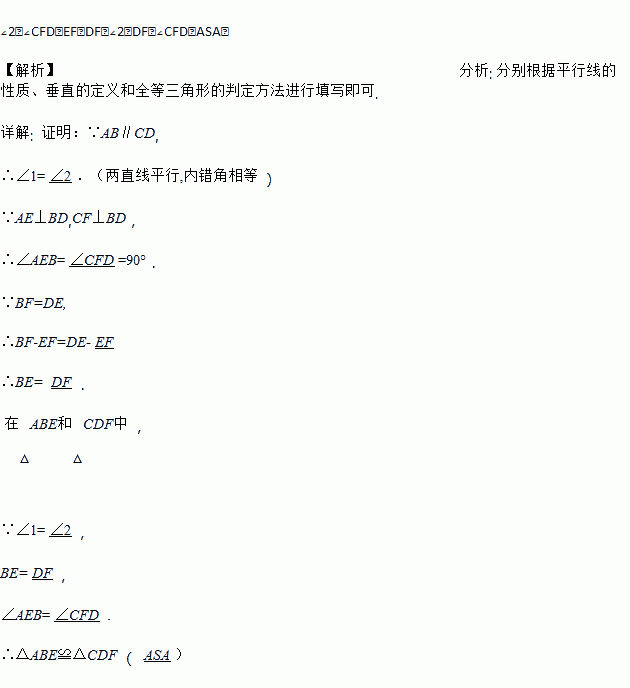 已知:如图,AB∥CD,AE⊥BD于E,CF⊥BD于F,BF=DE.