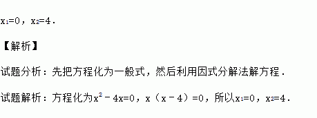 x1=0,x2=4. 【解析】 试题分析:先把方程化为一般式,然后利用因式分解法解方程. 试题解析:方程化为x2﹣4x=0,x(x﹣4)=0,所以x1=0,x2=4.