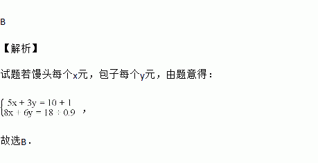 早餐店里,李明妈妈买了5个馒头,3个包子,老板少要1元,只要10元;王红爸爸买了8个馒头,6个包子,老板九折优惠,只要18元.若馒头每个x元,包子每个y元,则所列二元一次方程组正确的是( )