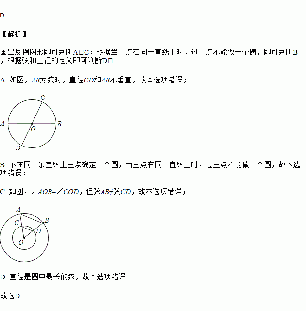 A. 平分弦的直径垂直于弦 B. 三点确定一个圆 C. 相等的圆心角所对弦相等 D. 直径为圆中最长的弦