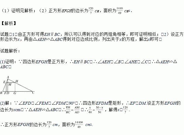 如图,△ABC为锐角三角形,AD是BC边上的高,正方形EFGH的一边FG在BC上,顶点E、H分别在AB、AC上,已知BC=40cm,AD=30cm.