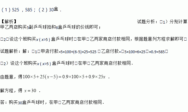 (1)525 ,585;(2)30盒. 【解析】试题分析:(1)分别计算甲乙两店购买5副乒乓球拍和6盒乒乓球的价钱即可; (2)设这个班购买x ( x>5 ) 盒乒乓球时,在甲、乙两家商店付款相同,根据题意列方程求解即可. 试题解析:【解析】 (1)甲店付款=5×100+(6-5)×25=525 ,乙店付款=(5×100+6×25)×0.9=585; (2)设这个班购买x...