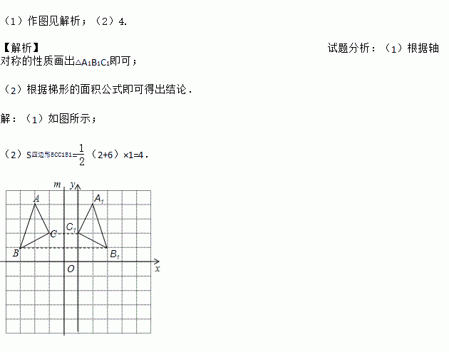 (1)请在正方形网格中作△A1B1C1,使它与△ABC关于直线m成轴对称,其中点A1,B1,C1分别是A,B,C的对称点.