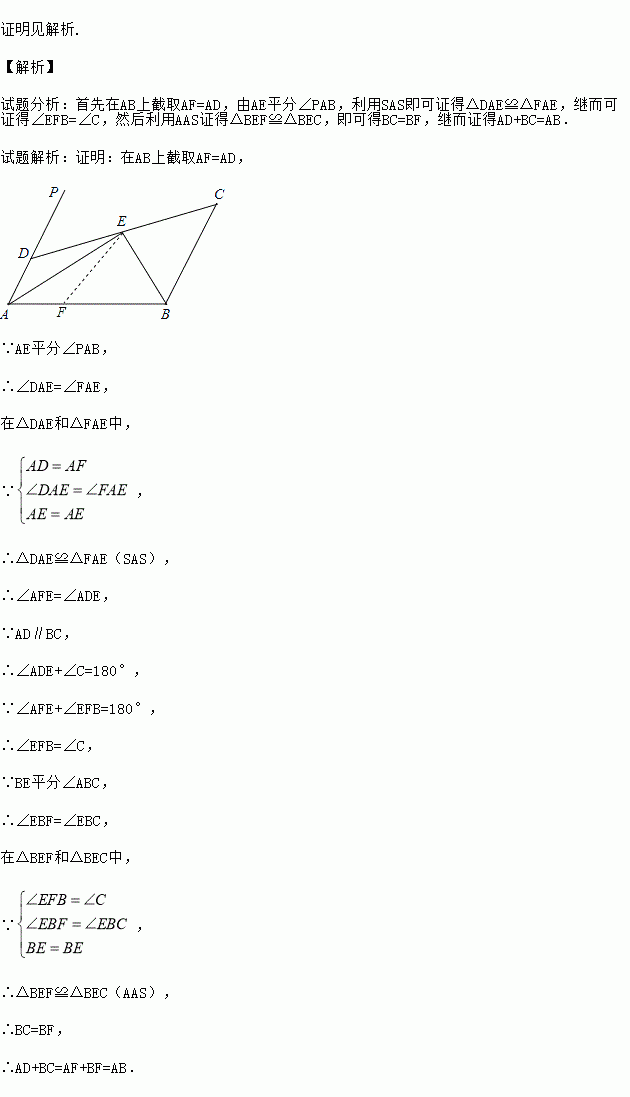 如图,已知AD∥BC,∠PAB的平分线与∠CBA的平分线相交于E,CE的连线交AP于D.