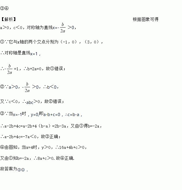 已知二次函数y=ax2+bx+c的图象如图所示,它与x轴的两个交点分别为(-1,0),(3,0).对于下列命题:①b-2a=0;②abc<0;③a-2b+4c<0;④8a+c>0.其中正确的有____________。