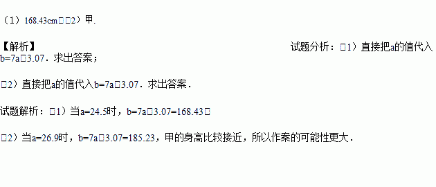 (2)在某次案件中,抓获了两名可疑人员,甲的身高为1.87 m,乙的身高为1.75 m,现场测量的脚印长度为26 .9 cm,请你帮助侦查一下,哪个可疑人员作案的可能性更大?