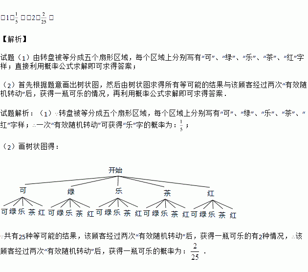 某超市为了答谢顾客,凡在本超市购物的顾客,均可凭购物小票参与抽奖活动,奖品是三种瓶装饮料,它们分别是:绿茶(500ml)、红茶(500ml)和可乐(600ml),抽奖规则如下:①如图,是一个材质均匀可自由转动的转盘,转盘被等分成五个扇形区域,每个区域上分别写有“可”“绿”“乐”“茶”“红”字样;②参与一次抽奖活动的顾客可进行两次“有效随机转动”(当转动转盘,转盘停止后,可获得指针所指区域的字样,我们称这次转动为一次“有效随机转动”);③假设顾客转动转盘,转盘停止后,指针指向两区域的边界,顾客可以再转动转盘,直到转动为一次“有效随机转动”;④当顾客完成一次抽奖活动后,记下两次指针所指区域的两个字,只要这两个字和奖品名称的两个字相同(与字的顺序无关),便可获得相应奖品;不相同时,不能获得任何奖品.