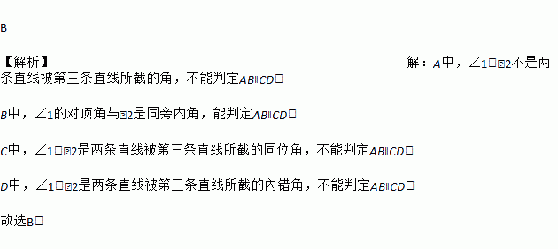 下列图形中,能由∠1+∠2=180°得到AB∥CD的是( )