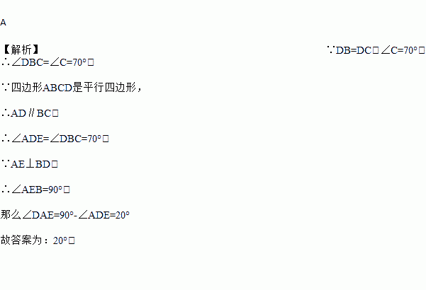 如图,□ABCD中,BD=CD,∠C=70°,AE⊥BD于点E,则∠DAE=( )