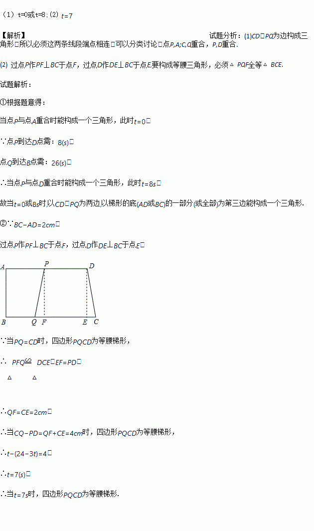 Èçͼ£¬ÔÚÖ±½ÇÌÝÐÎABCDÖУ¬AD // BC£¬¡ÏB£½90¡ã£¬AD£½24cm£¬BC£½26cm£¬¶¯µãP´ÓAµã¿ªÊ¼ÑØAD±ßÏòDÒÔ3cm/sµÄËÙ¶ÈÔ˶¯£¬¶¯µãQ´ÓµãC¿ªÊ¼ÑØCB±ßÏòµãÒÔ1cm/sµÄËÙ¶ÈÔ˶¯£¬µãP¡¢Q·Ö±ð´ÓA¡¢Cͬʱ³ö·¢£¬ÉèÔ˶¯Ê±¼äΪt (s)¡£µ±ÆäÖÐÒ»µãµ½´ï¶Ëµãʱ£¬ÁíÒ»µãÒ²ËæÖ®Í£Ö¹Ô˶¯¡£