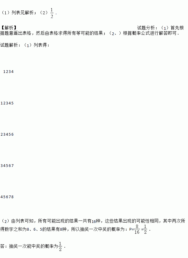 (1)列表见解析;(2). 【解析】试题分析:(1)首先根据题意画出表格,然后由表格求得所有等可能的结果;(2、)根据概率公式进行解答即可. 试题解析:(1)列表得: 1 2 3 4 1 2 3 4 5 2 3 4 5 ...