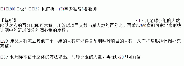 (3)如果该校共有1000名学生参加这四个课外活动小组,而每个教师最多只能辅导本组的20名学生,请通过计算确定学校需要为乒乓球课外活动小组至少准备多少名教师?