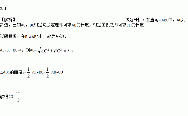 已知三角形ABC中∠C=90°,AC=3,BC=4,则斜边AB上的高为__________.