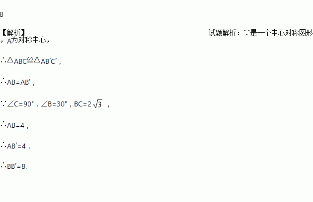 如图是一个中心对称图形,A为对称中心,若∠C=90°,∠B=30°,BC=,求BB′的长为 ______ .