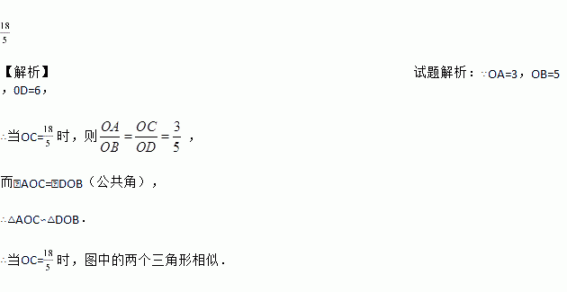 如图,AB与CD相交于点O,OA=3,OB=5,0D=6.当OC=______________时,图中的两个三角形相似.(只需写出一个条件即可)