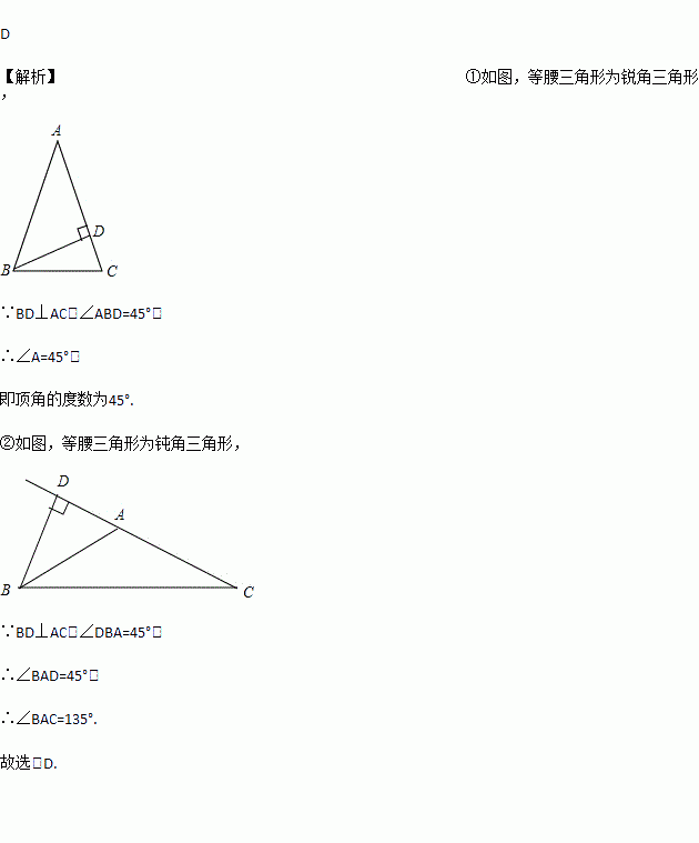 A. 45° B. 135° C. 45°或67.5° D. 45°或135°
