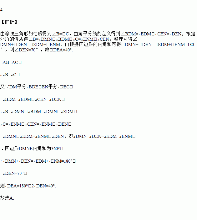 如图,三角形ABC中,AB=AC,D,E分别为边AB,AC上的点,DM平分∠BDE,EN平分∠DEC,若∠DMN=110°,则∠DEA=( )