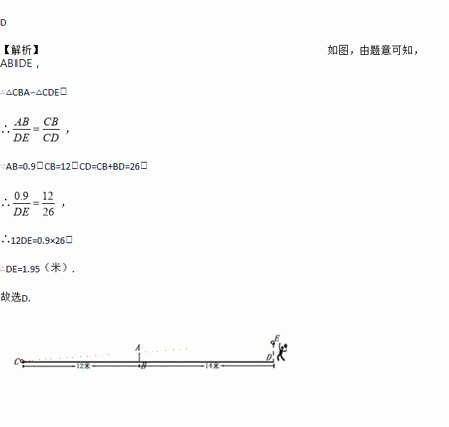 D 【解析】如图,由题意可知,AB∥DE, ∴△CBA∽△CDE, ∴, ∵AB=0.9,CB=12,CD=CB+BD=26, ∴, ∴12DE=0.9×26, ∴DE=1.95(米). 故选D.