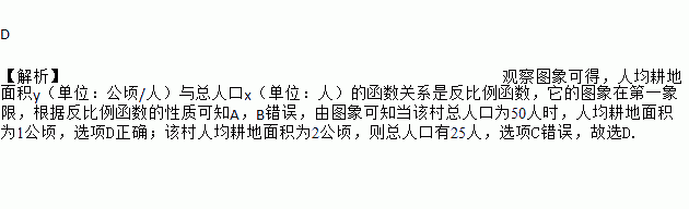 某村耕地总面积为50公顷,且该村人均耕地面积y(单位:公顷/人)与总人口x(单位:人)的函数图象如图所示,则下列说法正确的是( )