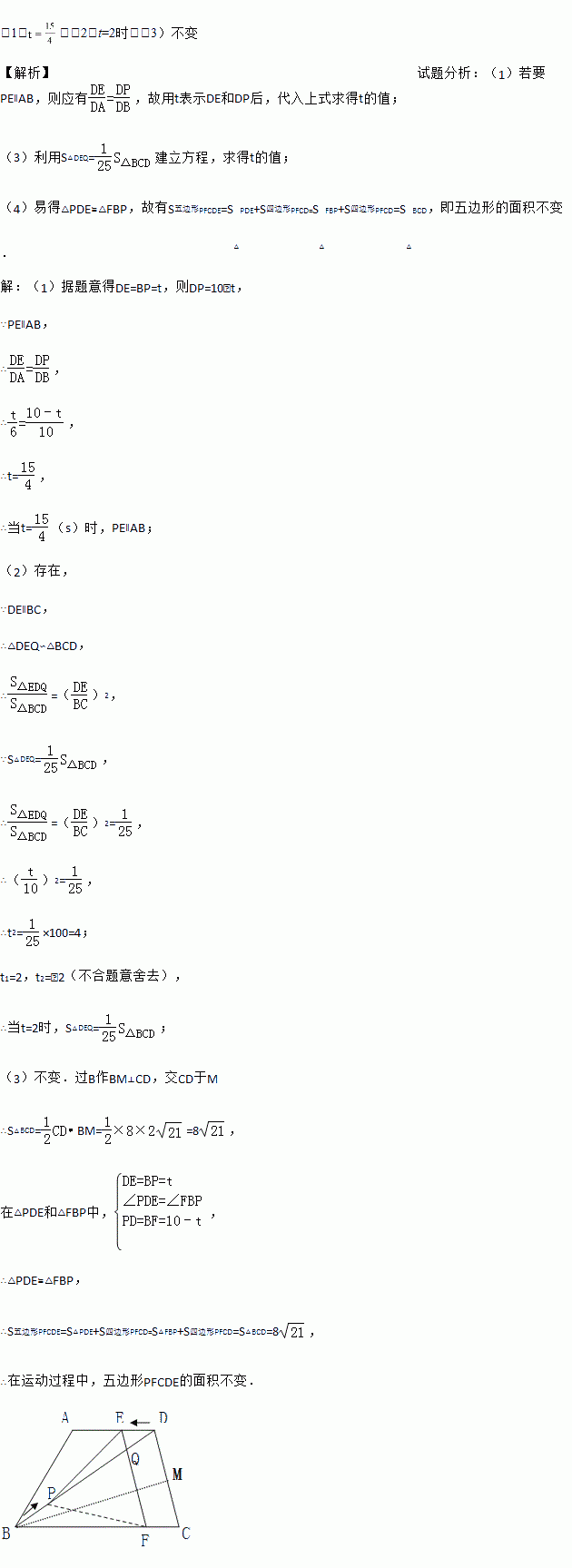 如图,在梯形ABCD中,AD∥BC,AD=6cm,CD=8cm,BC=BD=10cm,点P由B出发沿BD方向匀速运动,速度为1cm/s;同时,线段EF由DC出发沿DA方向匀速运动,速度为1cm/s,交BD于Q,连接PE.若设运动时间为t(s)(0<t<5).解答下列问题: