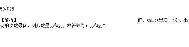 50和25 【解析】【解析】 50、25出现了2次,出现的次数最多,则众数是50和25,故答案为:50和25.