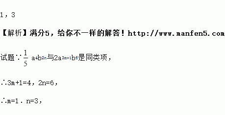 已知a4b2n与2a3m+1b6是同类项,则m= ,n= .