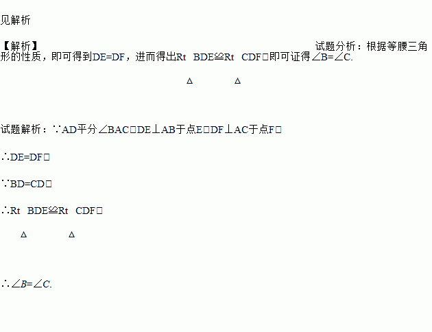 如图,在△ABC中,AD平分∠BAC,且BD=CD,DE⊥AB于点E,DF⊥AC于点F.求证:∠B=∠C.