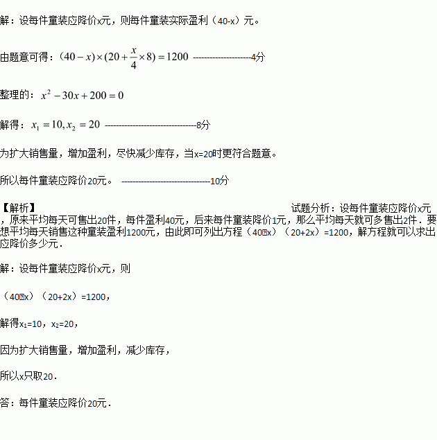 一儿童服装商店在销售中发现:某品牌童装平均每天可售出20件,每件盈利40元.为了迎接“六·一”儿童节,商店决定采取适当的降价措施,扩大销售量,增加盈利,尽快减少库存.经市场调查发现:如果每件童装降价1元,那么平均每天就可多售出2件.要想平均每天销售这种童装上盈利1200元,那么每件童装应降价多少元?