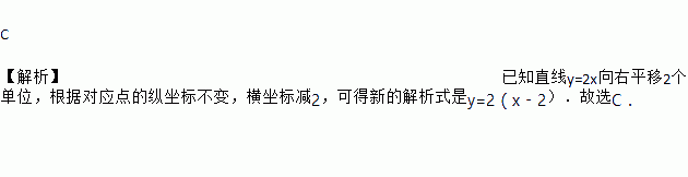 C 【解析】已知直线y=2x向右平移2个单位,根据对应点的纵坐标不变,横坐标减2,可得新的解析式是y=2(x﹣2).故选C.