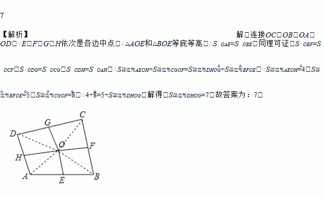 如图,四边形ABCD中,E、F、G、H依次是各边中点,O是形内一点,若四边形AEOH、四边形BFOE、四边形CGOF的面积分别是4、5、8,则四边形DHOG的面积是________.