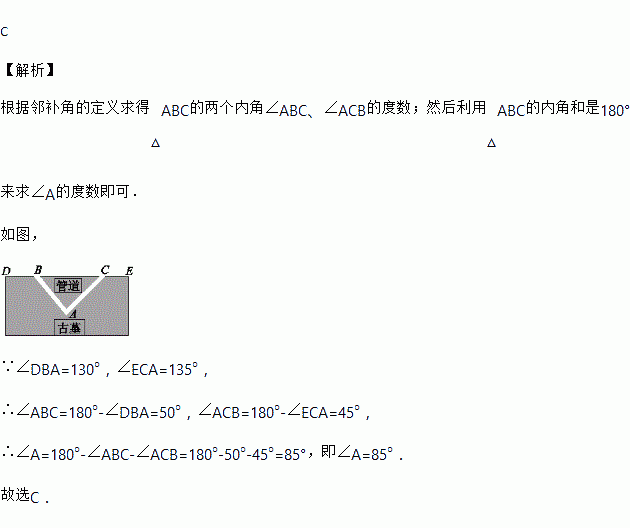 如图,考古学家发现在地下A处有一座古墓,古墓上方是煤气管道,为了不影响管道,准备在B,C处开工挖出“V”字型通道.如果∠DBA=130°,∠ECA=135°,那么∠A的度数是( )