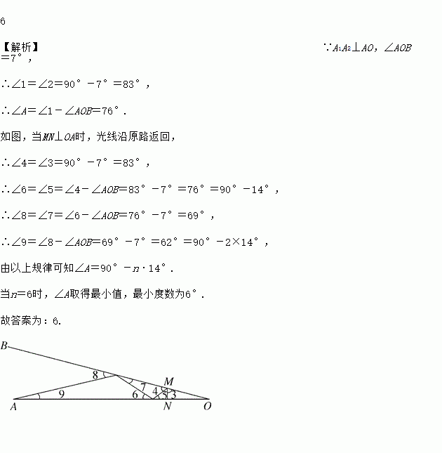 如图,已知∠AOB=7°,一条光线从点A出发后射向OB边.若光线与OB边垂直,则光线沿原路返回到点A,此时∠A=90°-7°=83°.当∠A<83°时,光线射到OB边上的点A1后,经OB反射到线段AO上的点A2,易知∠1=∠2.若A1A2⊥AO,光线又会沿A2→A1→A原路返回到点A,此时∠A=76°.…若光线从A点出发后,经若干次反射能沿原路返回到点A,则锐角∠A的最小值为______.