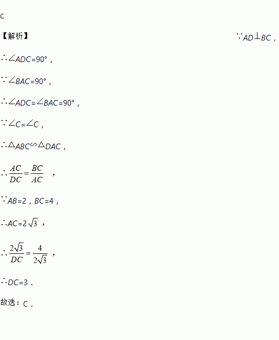 如图,在Rt△ABC中,∠BAC=90°,AD⊥BC,若AB=2,BC=4.则DC的长度为( )