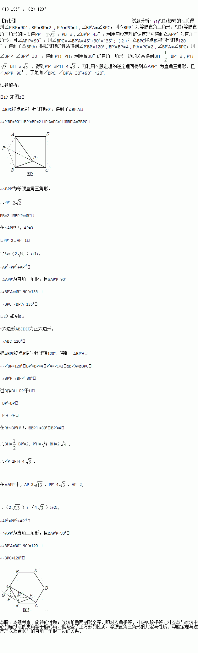 分析:根据已知条件比较分散的特点,我们可以通过旋转变换将分散的已知条件集中在一起,于是将△BPC绕点B逆时针旋转90°,得到了△BP′A(如图2),然后连结PP′,这时再分别求出∠BP′P和∠AP′P的度数.