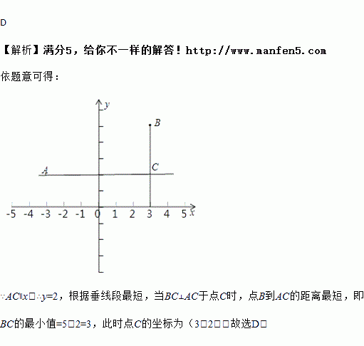 在平面直角坐标系中,点A(﹣3,2),B(3,5),C(x,y),若AC∥x轴,则线段BC的最小值及此时点C的坐标分别为( )
