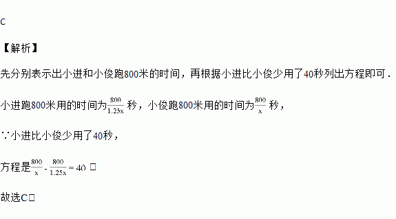体育测试中,小进和小俊进行800米跑测试,小进的速度是小俊的1.25倍,小进比小俊少用了40秒,设小俊的速度是米/秒,则所列方程正确的是( )