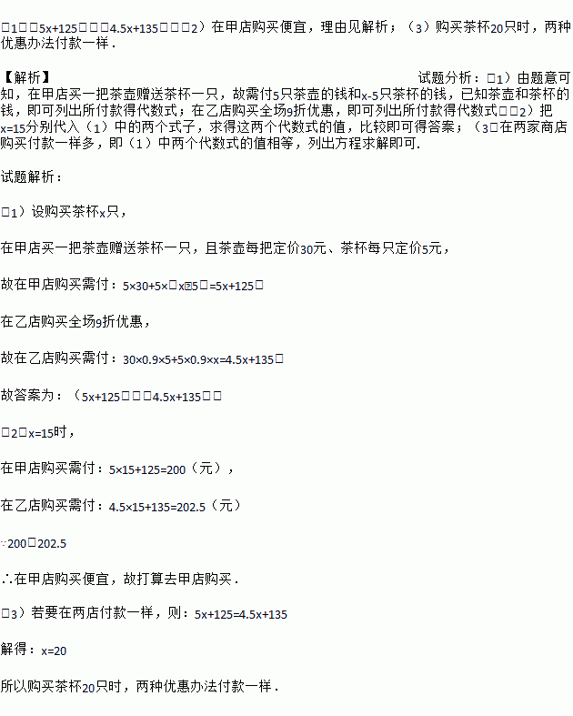 (1)(5x+125);(4.5x+135);(2)在甲店购买便宜,理由见解析;(3)购买茶杯20只时,两种优惠办法付款一样. 【解析】试题分析:(1)由题意可知,在甲店买一把茶壶赠送茶杯一只,故需付5只茶壶的钱和x-5只茶杯的钱,已知茶壶和茶杯的钱,即可列出所付款得代数式;在乙店购买全场9折优惠,即可列出所付款得代数式;(2)把x=15分别代入(1)中的两个式子,求得这两个代数式的值,比较...