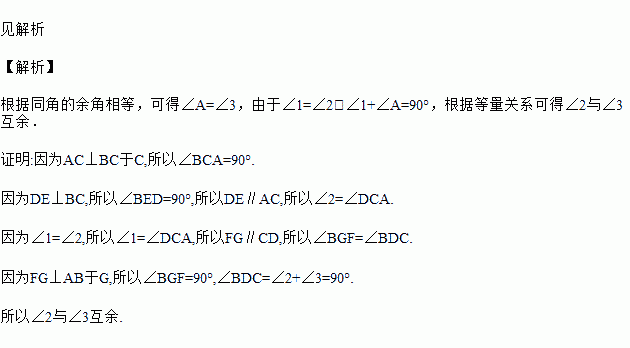 如右图所示,在ΔABC中,AC⊥BC于C,DE⊥BC于E,FG⊥AB于G,∠1=∠2,求证∠2与∠3互余.