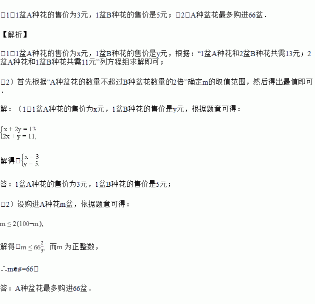 (2)学校准备购进这两种盆花共100盆,并且A种盆花的数量不超过B种盆花数量的2倍,请求出A种盆花的数量最多是多少?